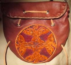 |  Distressed LeatherRustic, celtic design handstiched. Shoulder bag strap is 34". One large zipper pouch. Zippered top. Strap handstitched. $50 |